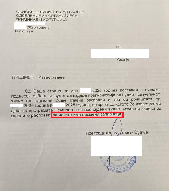 НЕКОРУМПИРАНИОТ АДВОКАТ кој го замолив да побара две конкретни снимки од две конкретни главни расправи, поднесе барање и доби повратен одговор дека снимките НЕ ПОСТОЈАТ во програмата ФЕМИДА! А не постојат затоа што тие снимки не се направени, а судечкиот судија и неговата заменичка која седела до него тоа НАМЕРНО НЕ ГО НАПРАВИЛЕ, за да нема аудио или аудио визуелн снимка од ова ЗЛОДЕЛО, од ова нефер судење, од оваа злоупотреба на судиска, обвинителска и адвокатска функција. Доказот го имате овде во прилог!
